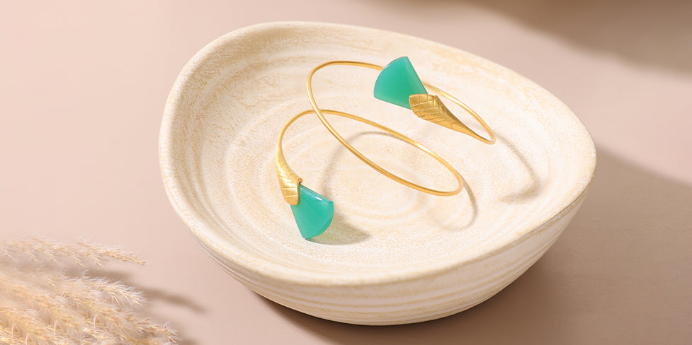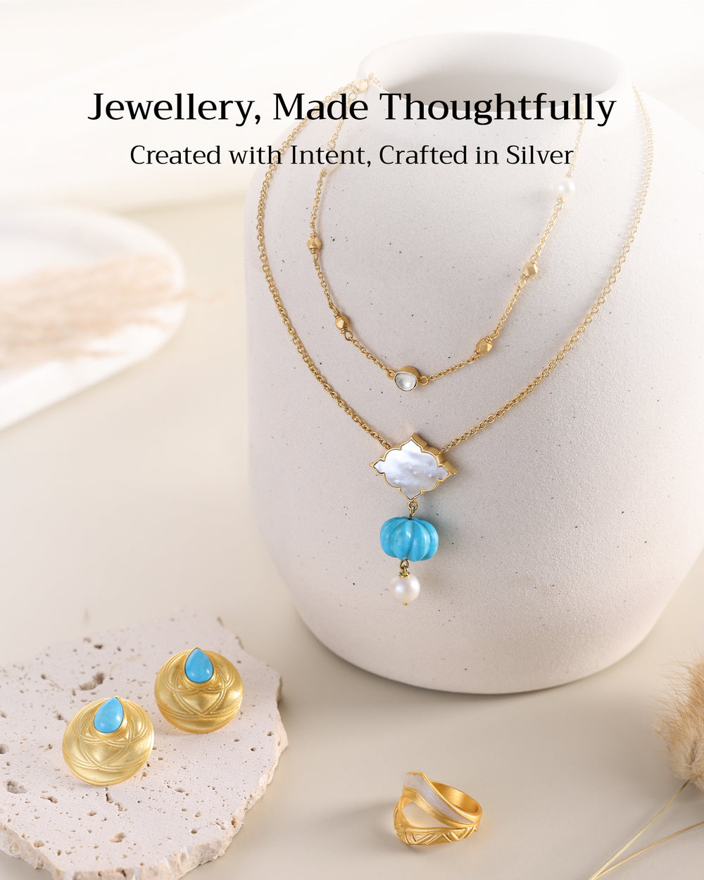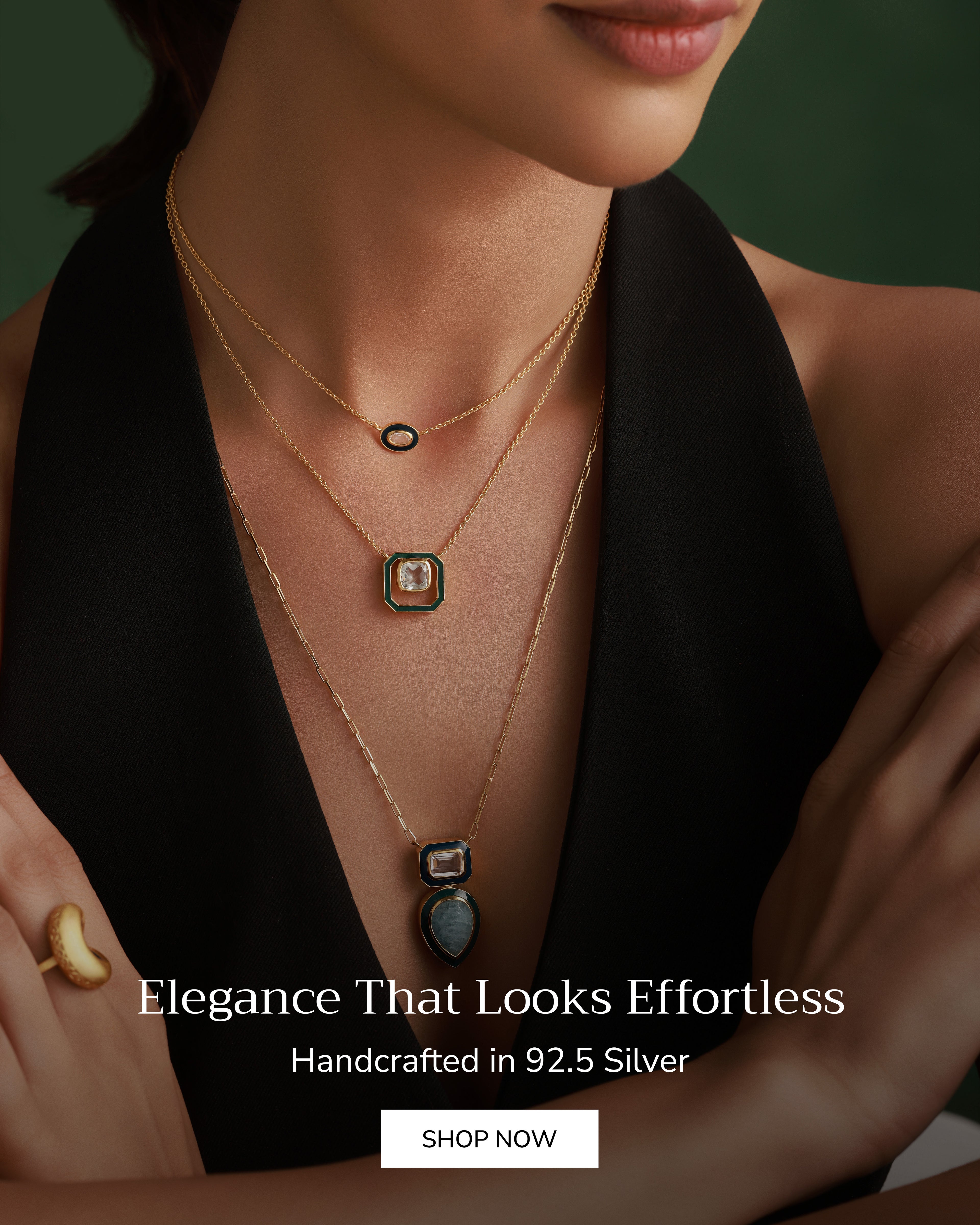 All our pieces are crafted in 92.5 sterling silver with 18K gold plating, finished to international standards. We use a blend of semi-precious and high-grade simulated stones. The plating is skin-friendly, long-lasting, and completely hypoallergenic.