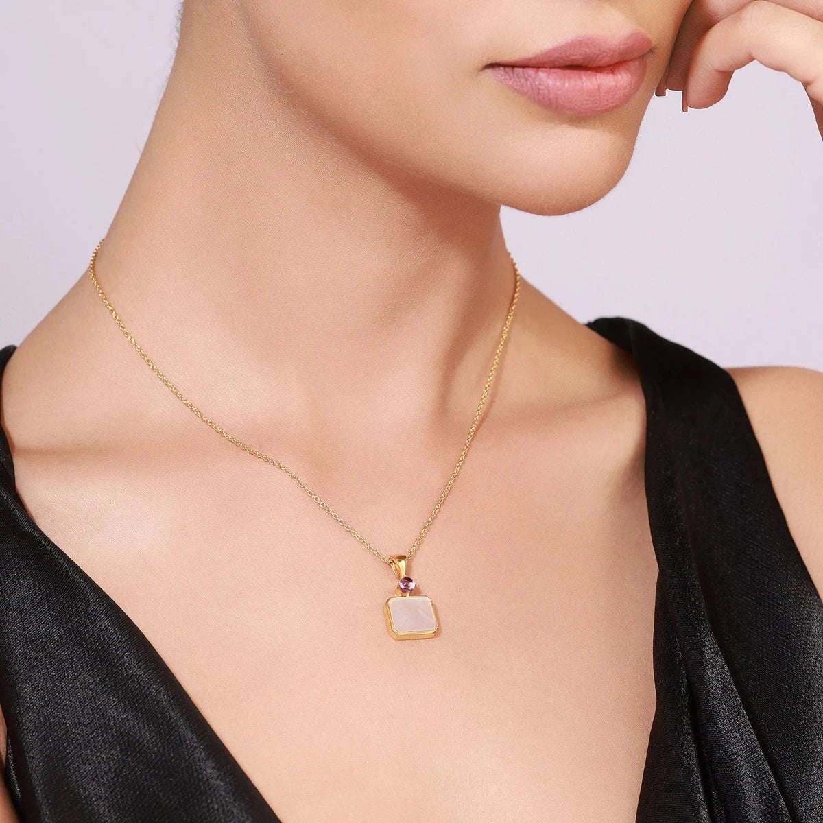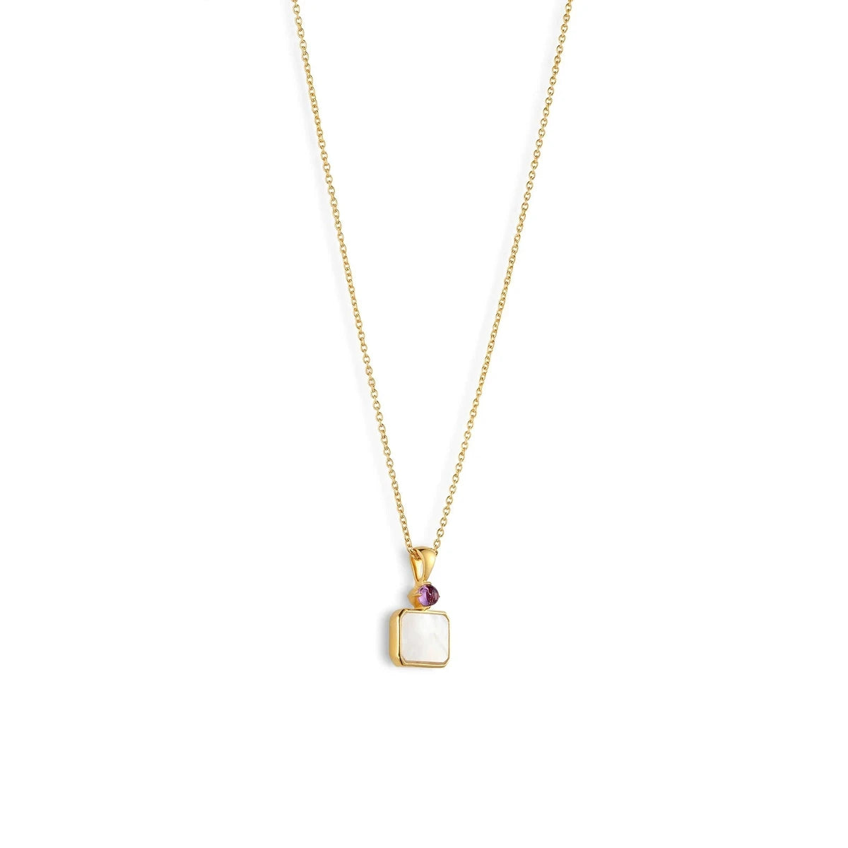 A drop of purple, a sliver of moonlight, the amethyst on the moon necklace is the kind of piece you wear without doubt and miss when it’s not there. A glint of purple sits above a geometric mother of pearl in a 925 pure silver, gold plated base, a pairing that is intentional yet effortless.