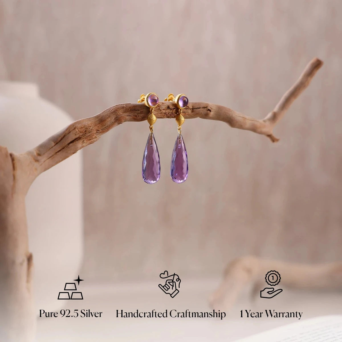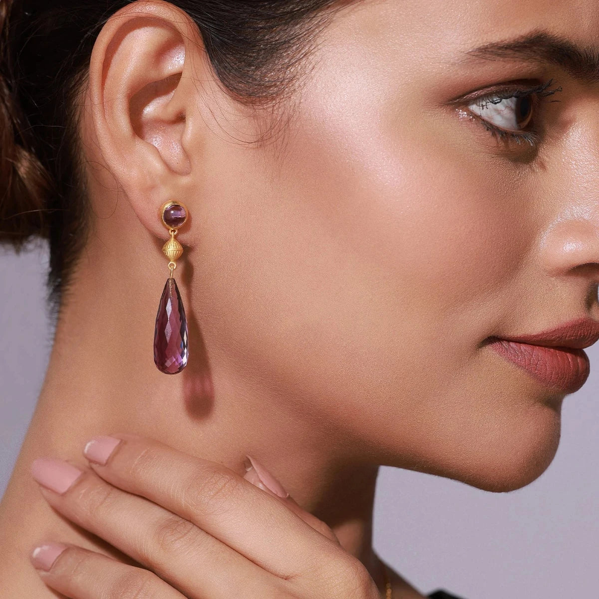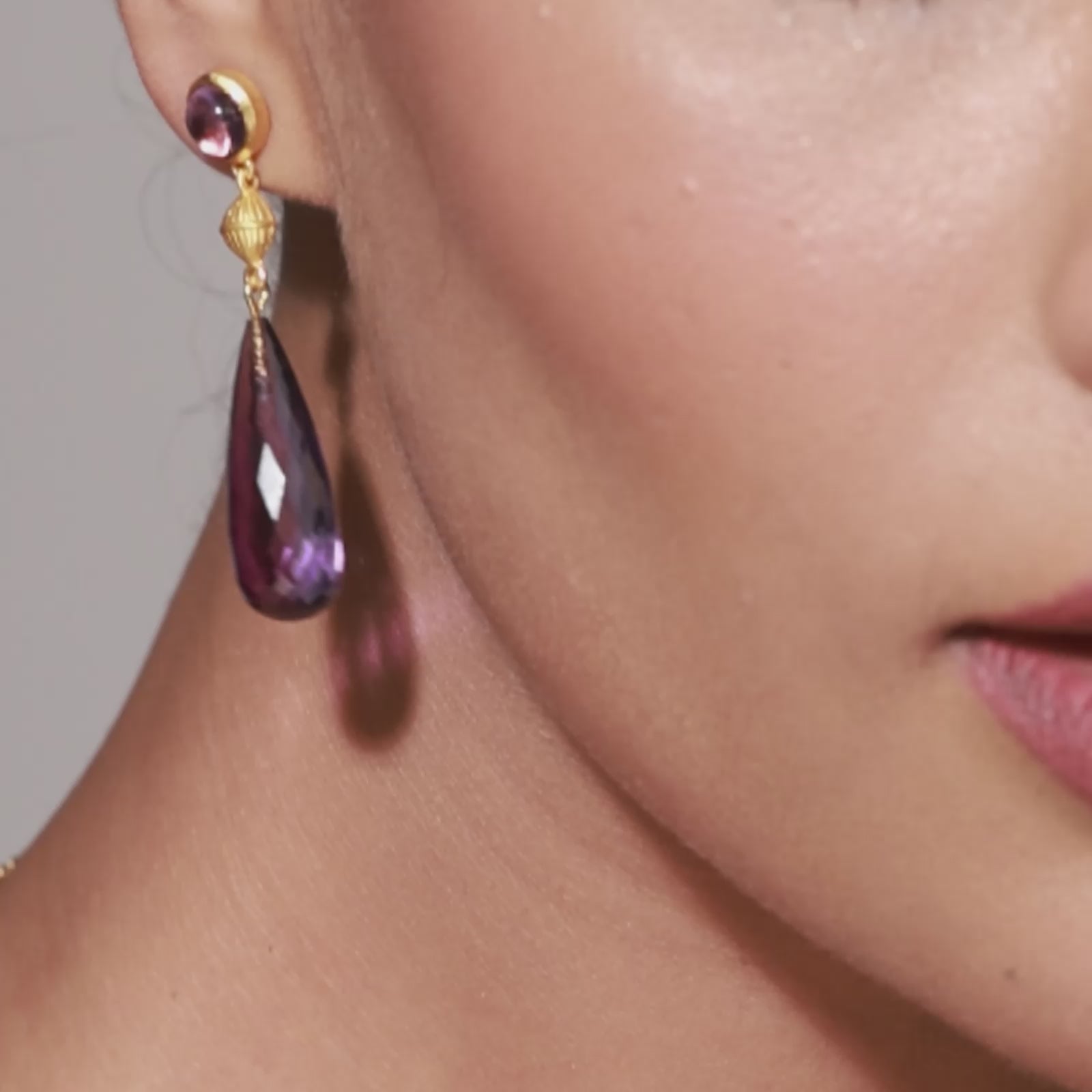 The Amethyst Royal Prism Earrings are a reflection of quiet luxury, catching light just right with every turn — echoing grace in the smallest movement, the softest glow.
