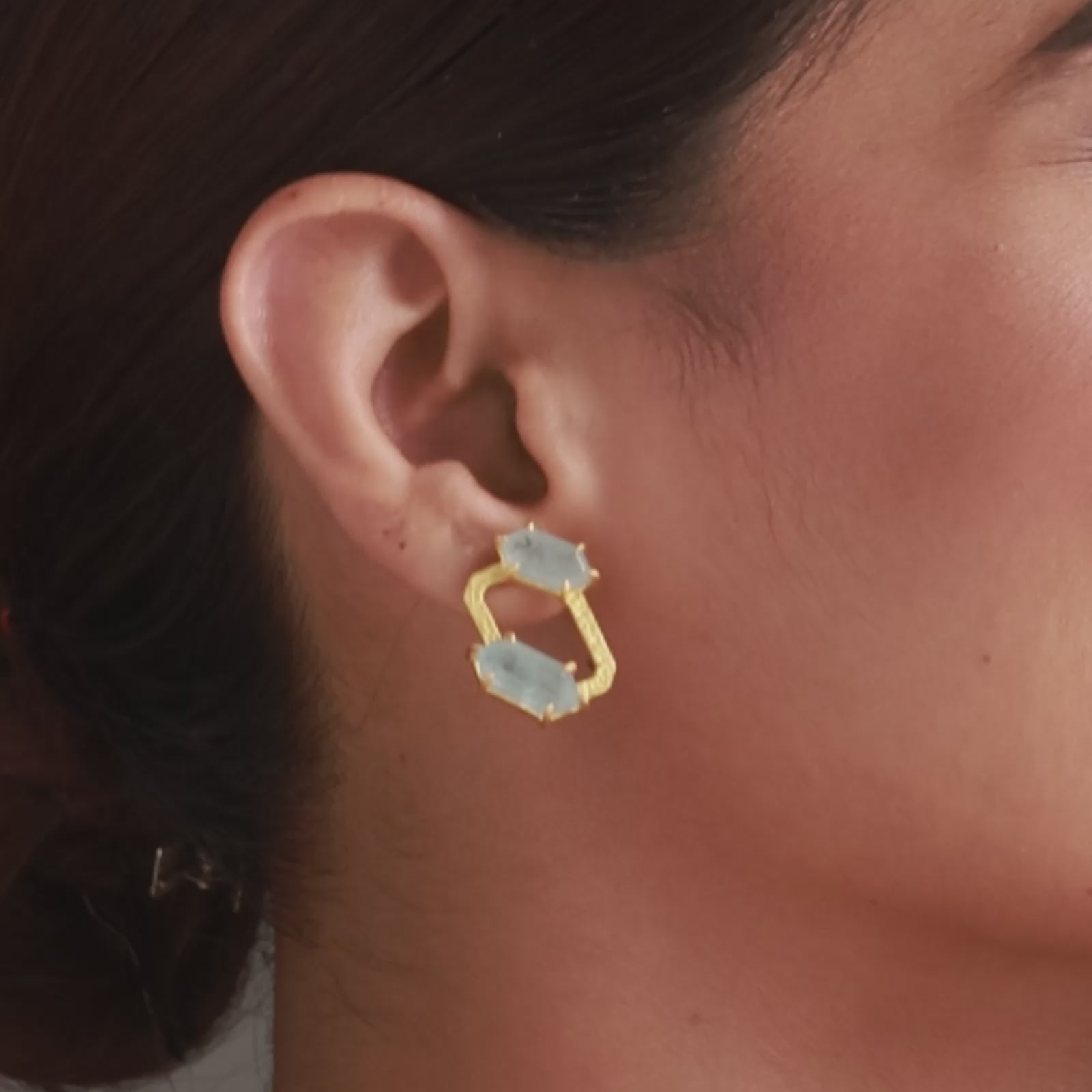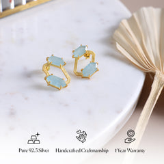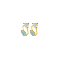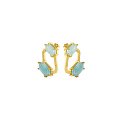 Inspired by the quiet brilliance of symmetry, featuring cool clarity from the aquamarine on either side of a hexagon and warmth from the 925 pure silver gold plated form. Lightweight yet grounded, these are the kind of earrings that work from morning yoga, to dinner parties. Abstract yet lightweight, this stud is a unique addition to your jewellery assortment and goes with halter tops as well as summer dresses!