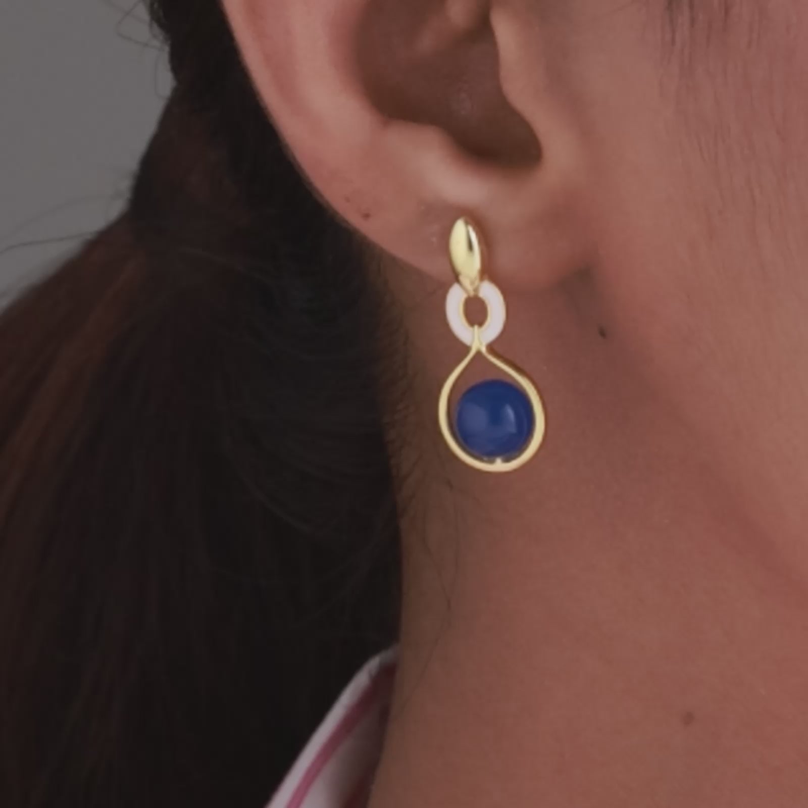 Featuring a luminous doublet blue quartz stone deliberately placed at the bottom of a fluid gold-plated silhouette, the design draws inspiration from the fluidity of water. Crafted in 925 silver, gold plated with a touch of subtle white enamel, this pair is perfect for when you want something that feels familiar yet new.
