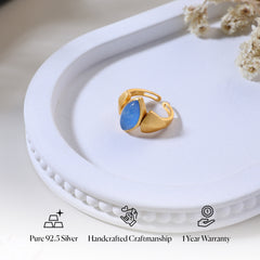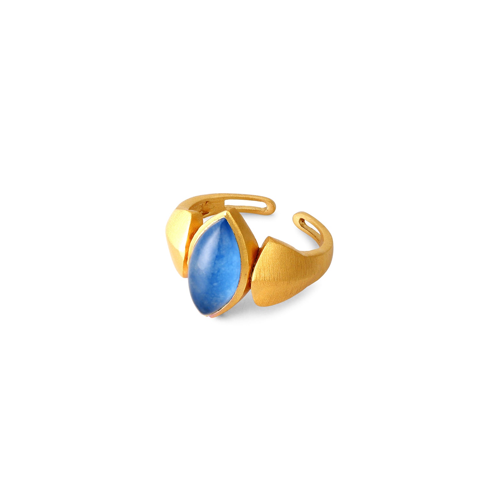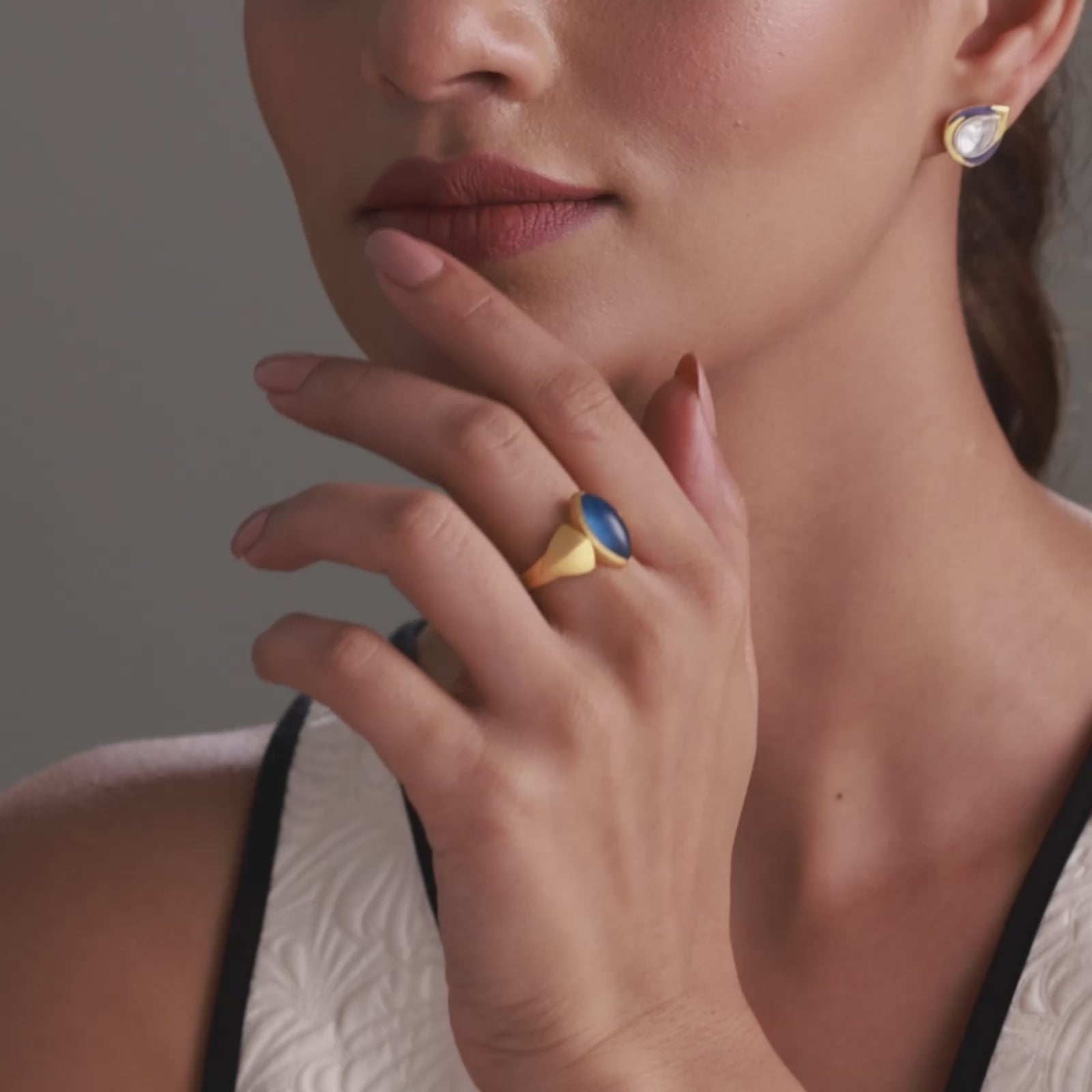 This ring features a marquise-cut doublet blue quartz at the centre, framed by two matte finished 925 pure silver gold plated forms. Navette, a shape once used in royal jewels is reimagined in this piece. The brushed finish gives it texture and restraint, a quiet counter to the stone’s color and glow. Wear it on days of clarity or days when you need to find yourself.