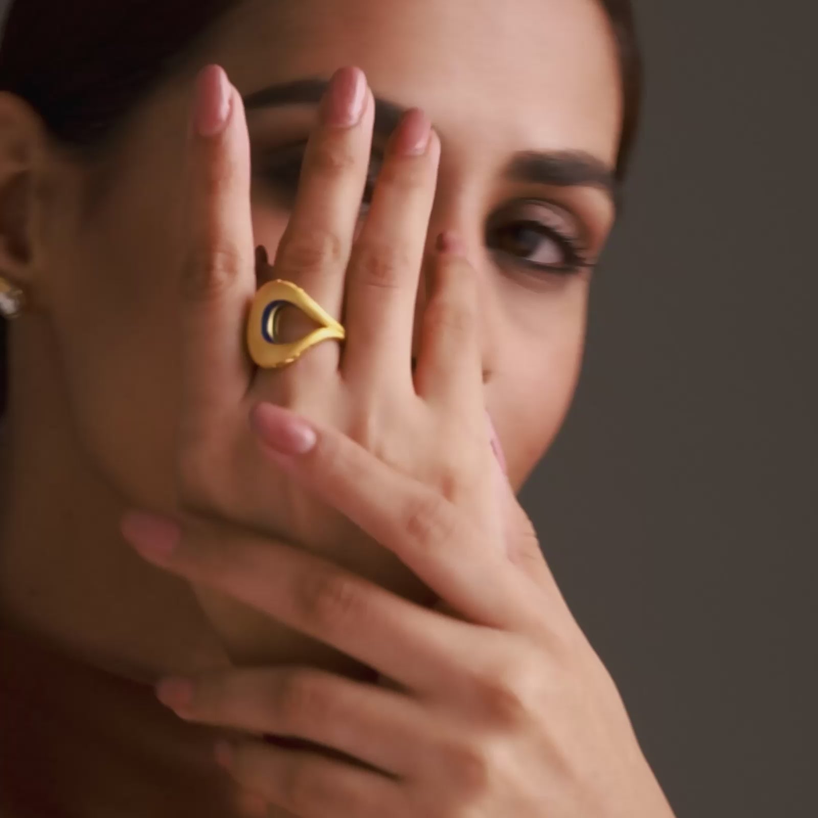 This sculptural ring is a tribute to the lands we come from. Crafted in 925 silver, plated in gold with green and blue enamel tucked within its bold form, the Echo of Indus carries the quiet power of natural forms and ancient flow. From a structured ethnic dress to your most worn-in jeans, it finds its place.