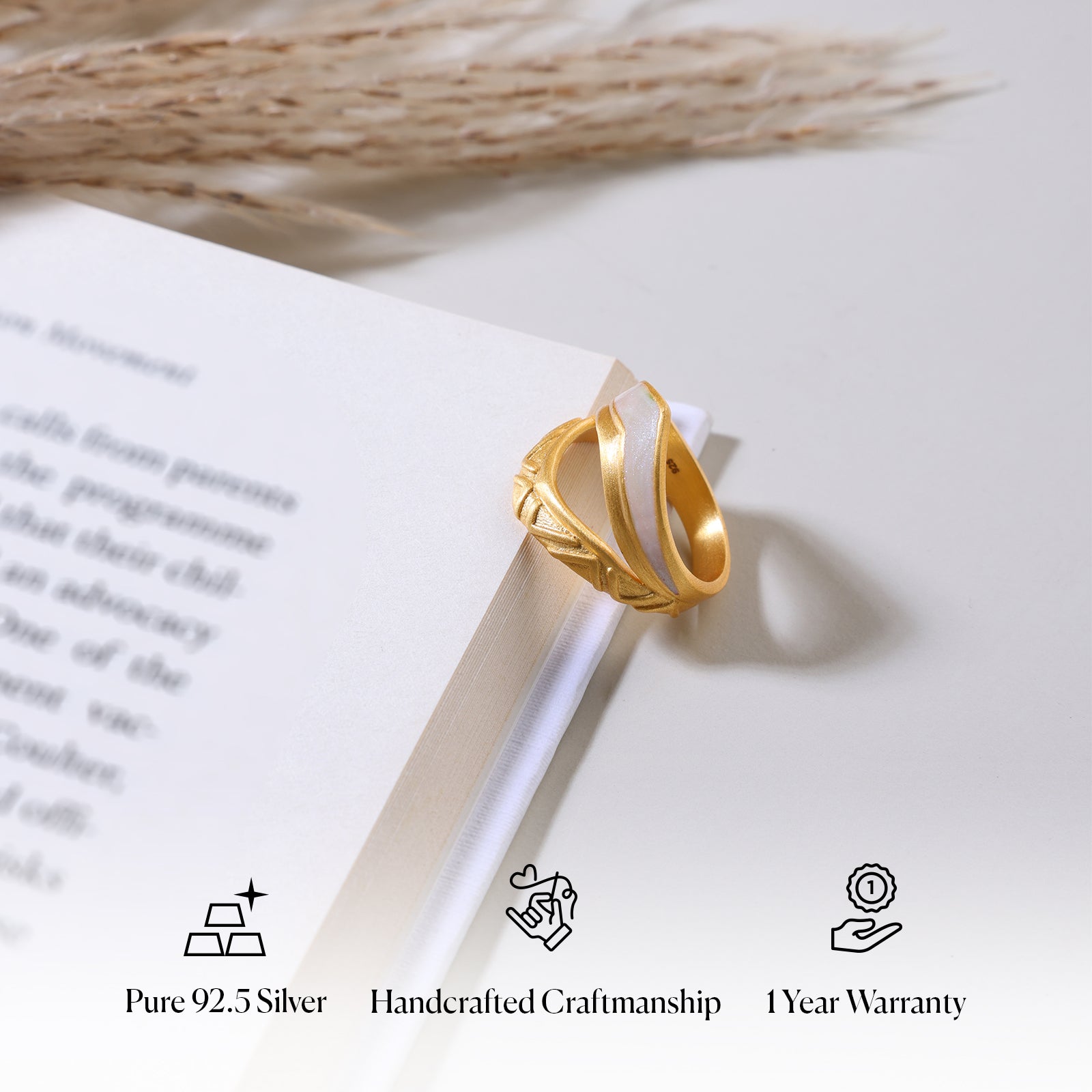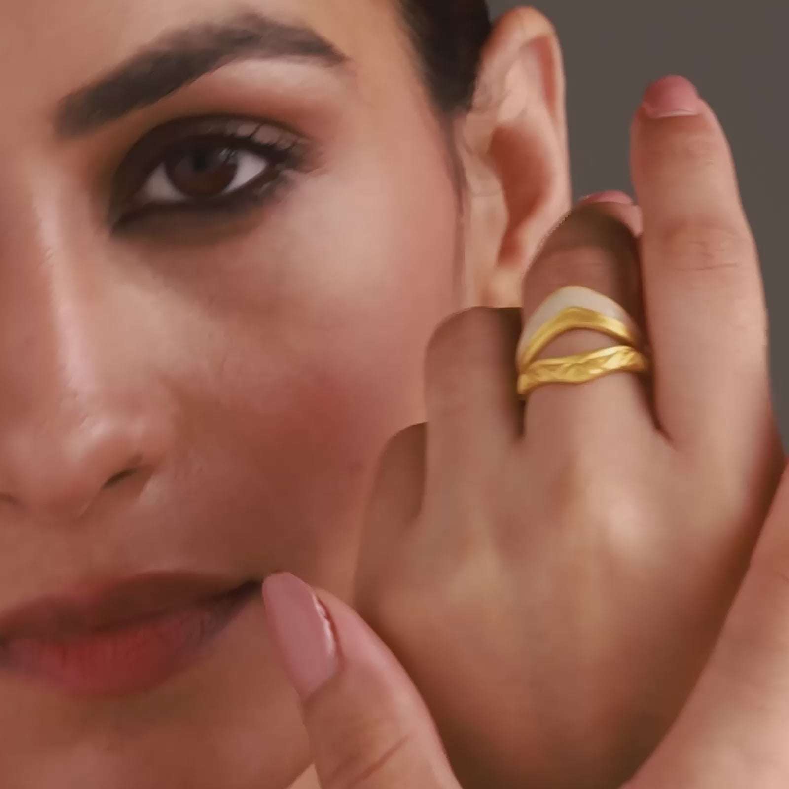 The Elavé Ring is made in 925 silver, plated in 18k gold and finished with a soft glint of pearl enamel. It traces a peak, a curve, a moment of rising and a fine engraving adds depth to the form. A quiet companion for every day and every version of you.