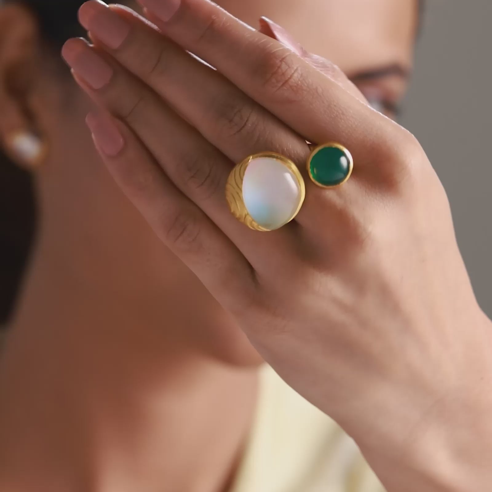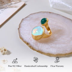 Green onyx flickers like flame while doublet opal glows like a full moon held together in a sculpted 925 pure silver band with fine engraving, finished in 18K gold plating. It wraps around your finger like a quiet reminder that strength and softness are not opposites, but partners. From cocktail parties to everyday denim looks, they add their story everywhere.