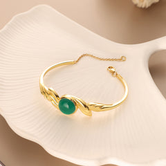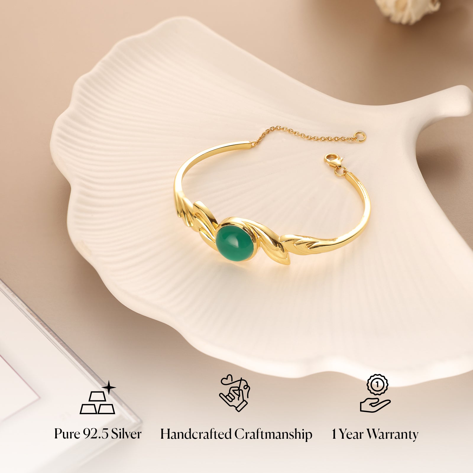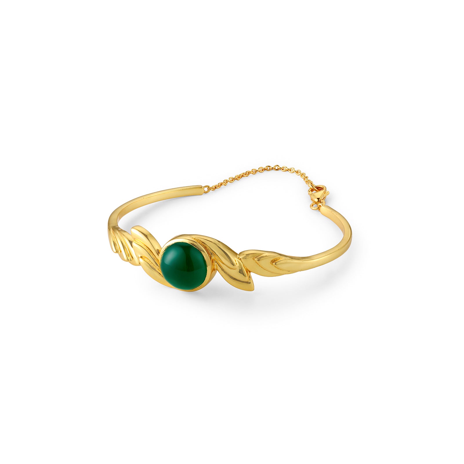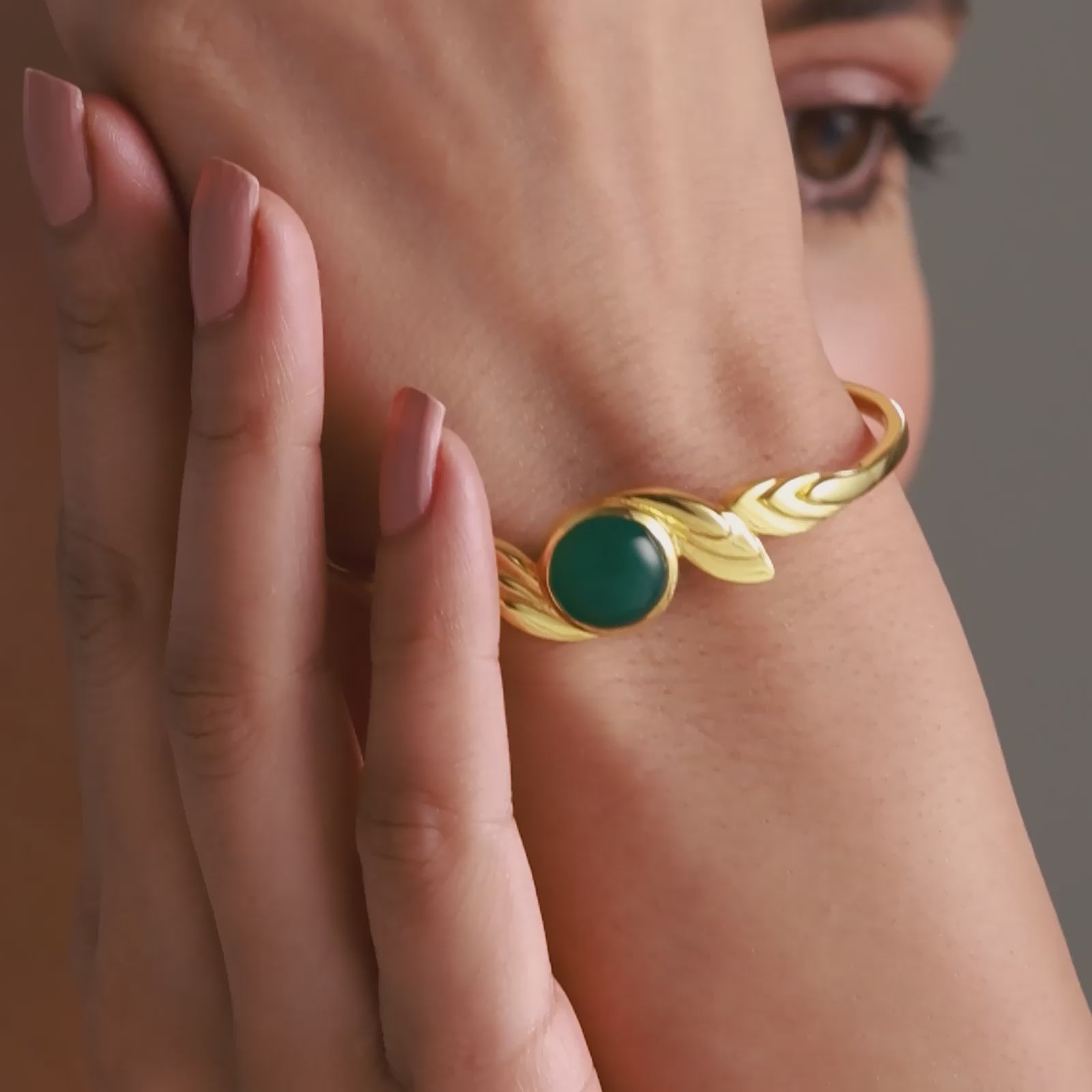 Inspired by the way nature embraces light, this bracelet wraps a vivid green onyx stone in sculpted golden leaves. The golden leaf bracelet is crafted in 925 pure silver and coated in 18k gold. Perfect with soft fabrics and open sleeves.