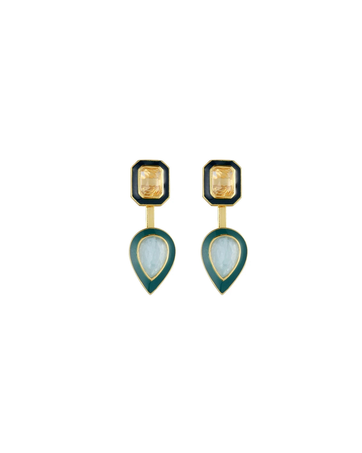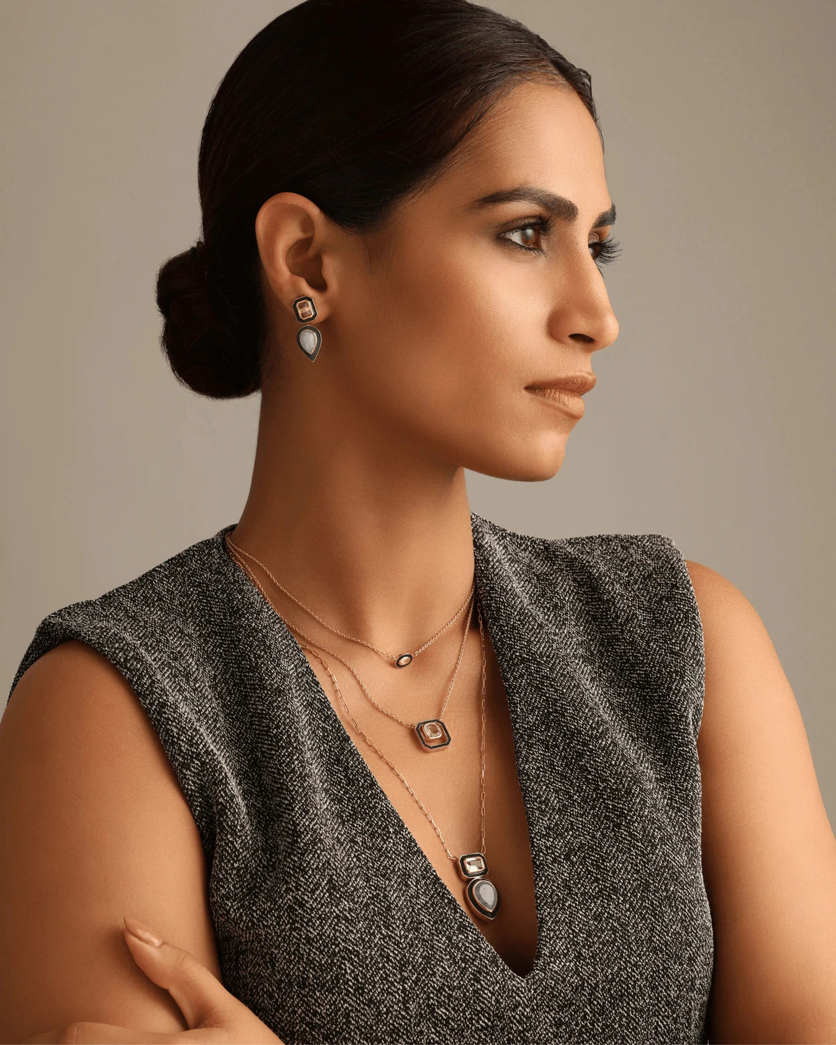 Inspired by the different phases of the midnight sky, this entire ensemble is a symbol of the quiet inner strength of the Indian woman. These are the stories that do not end but evolve. These pendants and earrings are made with crystal, green amethyst and aquamarine surrounded by enamel work and set in 925 pure silver with 18K gold plating. The necklaces are finished with a 2-inch extender, offering just the right amount of adjustability so they sits exactly where you want it