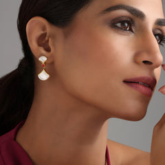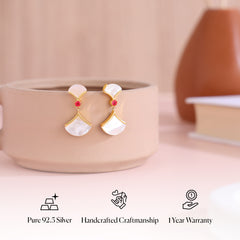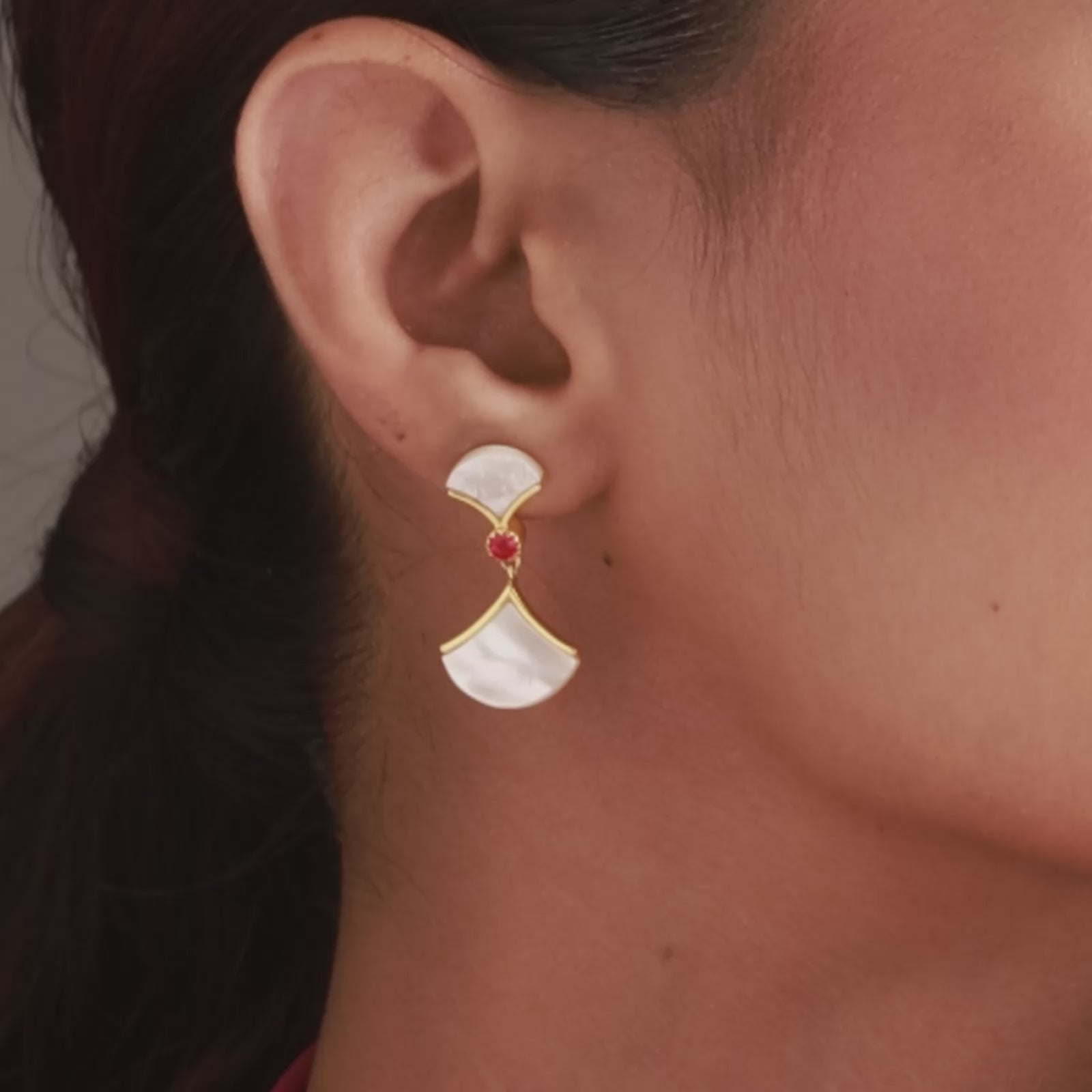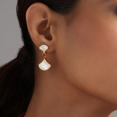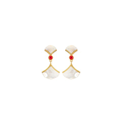 This earring brings together the calm of the moon and the warmth of firelight. Set with two half-moons of mother of pearl, anchored by a vibrant doublet red quartz, this design plays with light, balance, and movement. Let it sway with you from quiet mornings to festive evenings.