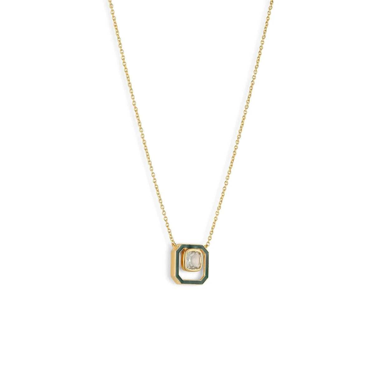A quiet statement. A soft reminder. A little light, always with you. Like a glimpse of the moon through the window, the Moonframe Necklace captures a moment of quiet and clarity. The centrepiece, a cushion cut green amethyst seated in a dark green enamel frame is suspended from a 925 pure silver delicate chain, plated in gold. This piece rests mid-length on the neckline, making it perfect for layering or as a statement on its own.