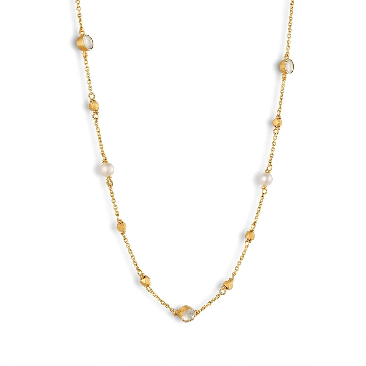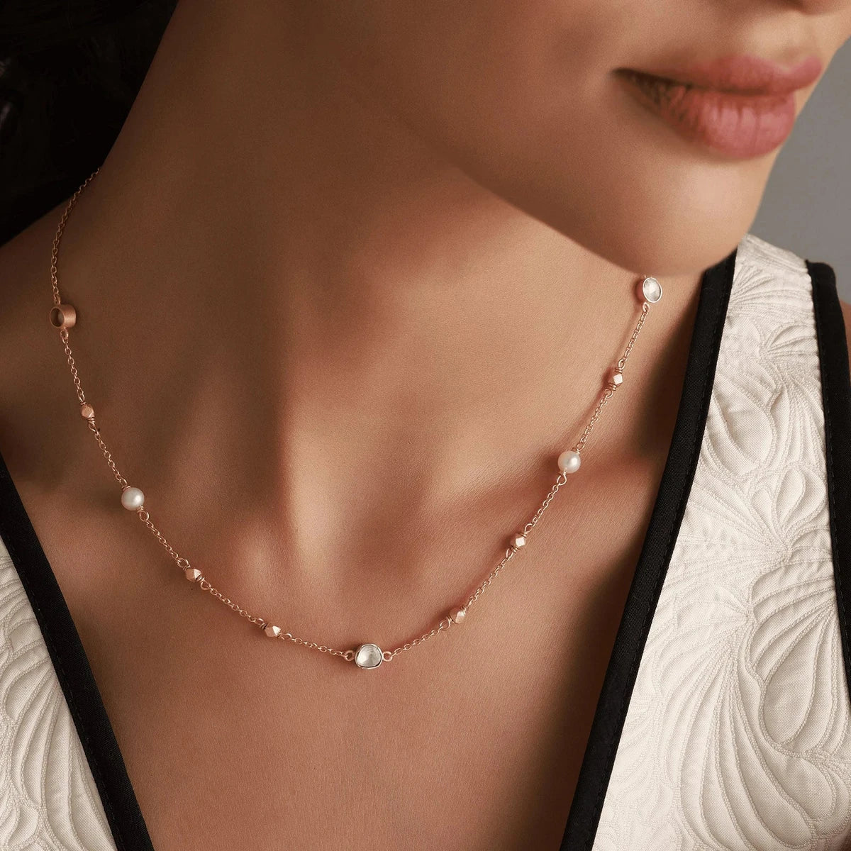 The subtle contrast of the polki, pearl and the textured metal beads bring depth and drama. This piece is perfect for someone who appreciates the finer details. Made in 925 pure silver, plated in gold, finished with a 2-inch extender, the necklace offers just the right amount of adjustability so it sits exactly where you want it. Wear it individually for a minimal look or pair it with other pieces from the collection like the Feroza Lune Neckace.