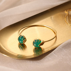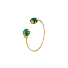 A minimal, refined beauty that effortlessly goes with anything. Two green onyx stones rest like buds at each end of a sculptural 925 pure silver, gold plated bangle, their floral prong settings adding a touch of grace. Pairs just as effortlessly with a crisp white shirt as it does with a flowing saree.
