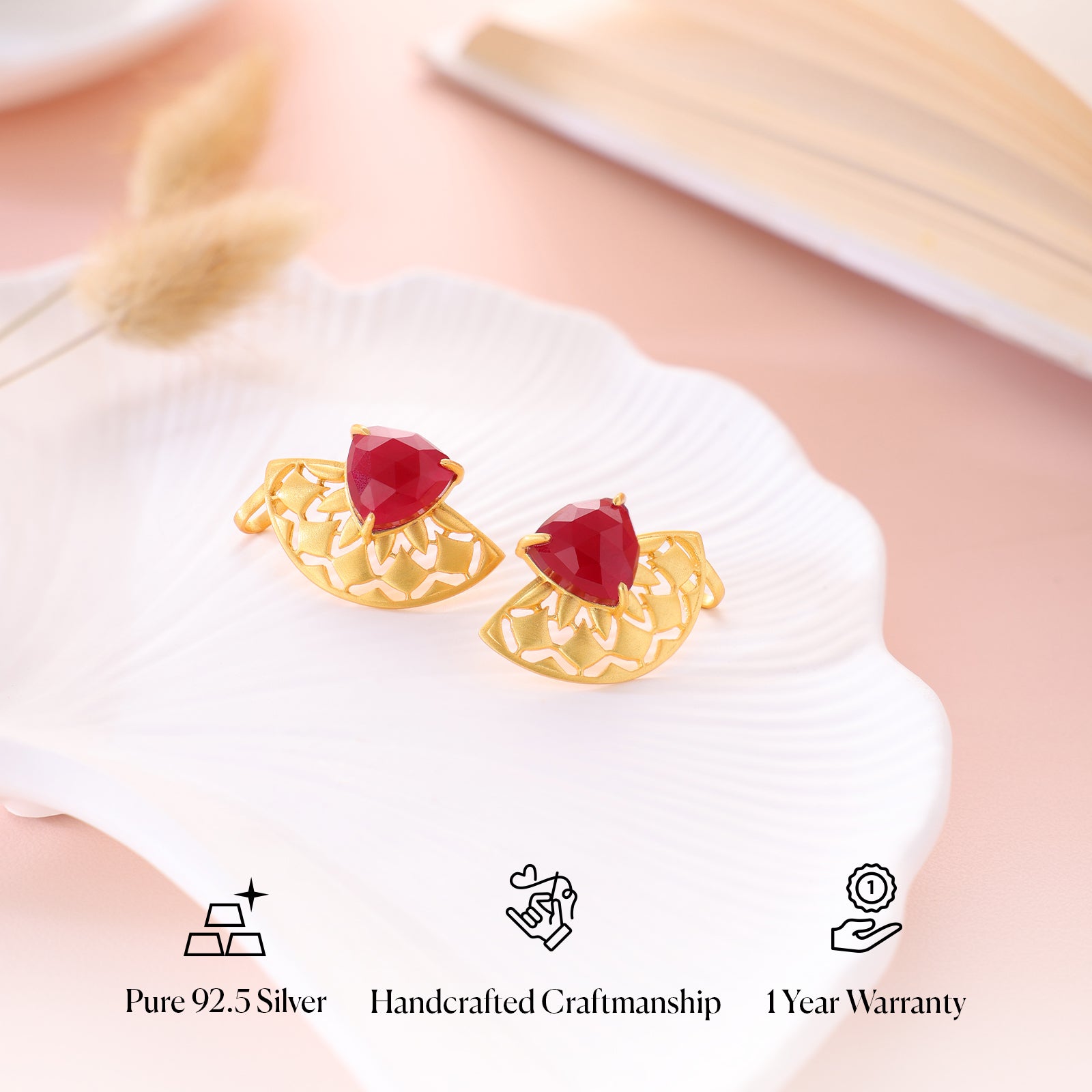 Made for the woman who honours where she comes from and where she’s headed. The Traya Cuff draws inspiration from the quiet brilliance of temple jaalis and the warmth of the sacred fire.It’s not merely an ornament, it is a gentle collision of the past and present. Made in 925 pure silver and plated in gold, it holds a doublet red quartz in a matte gold base with intricate jaali details. Structured enough for formal wear, soulful enough for festive dressing, this piece is as versatile as they come.